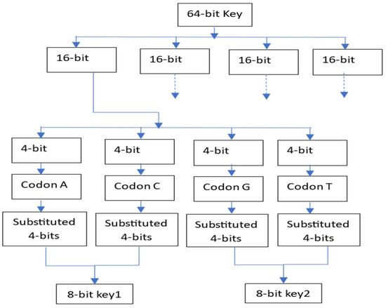No matter how long a DNA sequence is, each of the four letters carries a collection of bits arranged in random order. These letters are used to create keys for the suggested algorithms. As seen in Table 1, each letter corresponds to a group of sequences. These sequences are combinations of adenine, cytosine, guanine, and thymine (A, C, G, and T, respectively). In Figure 1, the key generation process is explained. The 64-bit key will be split into four 16-bit blocks, each of which will then be separated into four bits. These four-bit sequences, which are made up of the four-letter DNA sequences—A, C, G, and T—are formed as presented in the table and are used to represent the secret key (SK).