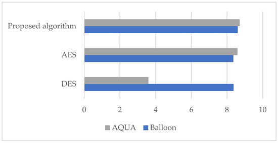 The PSNR results demonstrate that the recommended technique—as shown in Table 6 (the comparison with the existing algorithms is shown in Figure 6)—created a similar degree of distortion in the encrypted image when compared to the alternative approaches.