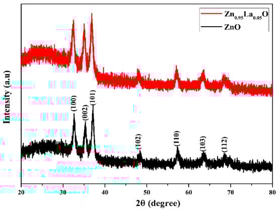 The XRD spectra of the deposited films are shown in Figure 1. Both the films showed a polycrystalline nature, and the noticed peaks matched the wurtzite structure. The spectra showed seven peaks at (1 0 0), (0 0 2), (1 0 1), (1 0 2), (1 1 0), (1 0 3), and (1 1 2). The orientation of the peaks mainly depends on the atom configurations on the subsequent layers and primarily depends on the deposition parameters. The intensity of the (1 0 1) peak increased for Zn0.95La0.05O films. The shift of the diffraction peak toward the lower-angle side after lanthanum doping was observed. The estimated structural parameters are tabulated in Table 1.