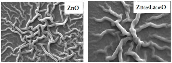 The morphology of ZnO and Zn0.95La0.05O films is shown in Figure 2. The pure ZnO films showed a fibrous morphology. The change in morphology from fibrous to a mixed granular–fibrous one was observed with the addition of lanthanum into the ZnO lattice. This change is due to the replacement of Zn2+ by La3+ ions. The lanthanum tends to change the morphology from fibrous to granular; however, compared to granular, fibrous was more observed due to the lower doping percentage of lanthanum. Hence, the lanthanum doping into the ZnO lattice changes the morphology of the deposited films.