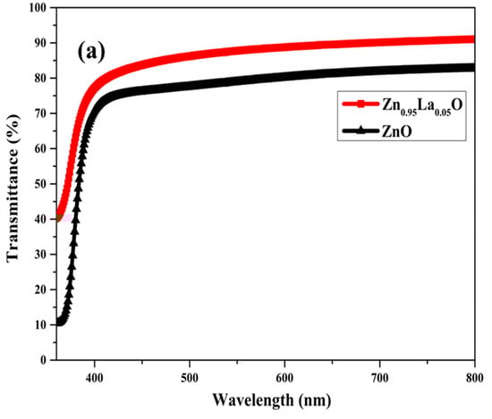 The transmittance and Tauc’s plot of the deposited films are shown in Figure 3a,b. Both ZnO and Zn0.95La0.05O films showed high transparency. Transparency in the range of 70% was noticed for ZnO films. However, the transparency increased after the lanthanum doping due to the increased crystallinity. As the crystallinity increases, the light travels easily through the films without being deflected. However, in the case of ZnO, the XRD results show a smaller crystallite size and higher strain and dislocation density values. Hence, due to the increased defects, the transparency of the film decreased. The shift in the absorption edge of Zn0.95La0.05O films confirms the better optical properties.
