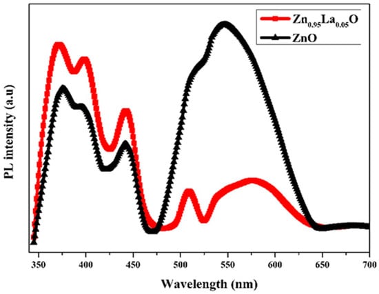 Photoluminescence spectra of ZnO and Zn0.95La0.05O films.