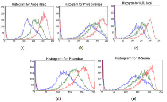 Color is the most important visual feature to identify the turmeric variety, as each of them has a slight difference in color [15]. RGB color histograms of each of the five varieties’ images are shown in Figure 4. The image color is represented using a different color model. RGB, LAB and HSI are frequently used models that provide unique images that correspond to each colorspace. Hence, 27 color features of the turmeric image area were extracted, like mean, range and variance, for the separate color channels of RGB, HSI and LAB images. The RGB color histograms of the five turmeric varieties are shown in Figure 4.