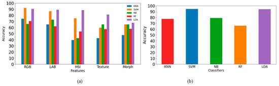 Performance of different classifiers on five varieties of turmeric rhizome data (a) using all the extracted features and (b) using selected features.