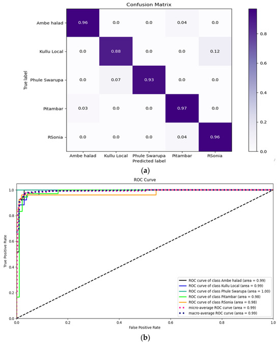 (a) Confusion matrix and (b) AUC-ROC curves of SVM classifier for the turmeric rhizome classification.