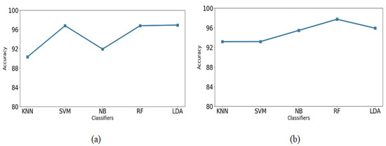 Accuracy of classifiers when applied to (a) Pitambar and R-Sonia, and (b) Phule Swarupa and Kullu Local, with selected features.