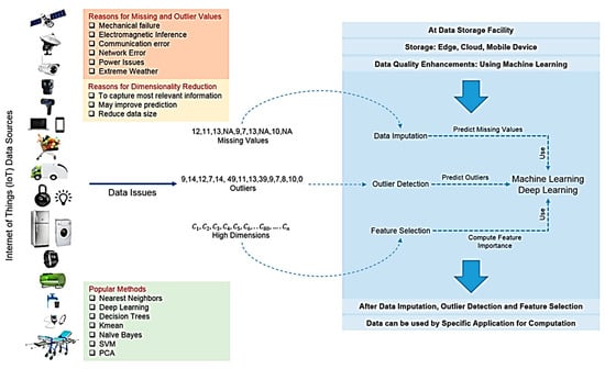 The IoT is integrating low-cost sensors with distributed intelligence, changing how we perceive and interact with the world. This combination will generate massive data with valuable insights. Data quality is compromised by imperfect sensing devices. MLAs must pre-process IoT data to extract meaningful information []. Figure 4 shows three detected data issues: outliers, missing values, and feature selection.
