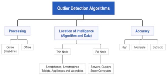 Outliers are abnormal data trends. Low-cost, low-quality sensors; ambient influences; electronic inferences; and data connection problems make outlier observations likely in dense sensor systems like the IoT []. MLAs find outliers rather than remove or replace them to gain useful insights from data. MLAs are increasingly used for knowledge acquisition and anomaly detection to improve data quality []. WSNs, a subset of the Internet of Things, have studied outlier concerns []. Figure 3 illustrates this further.