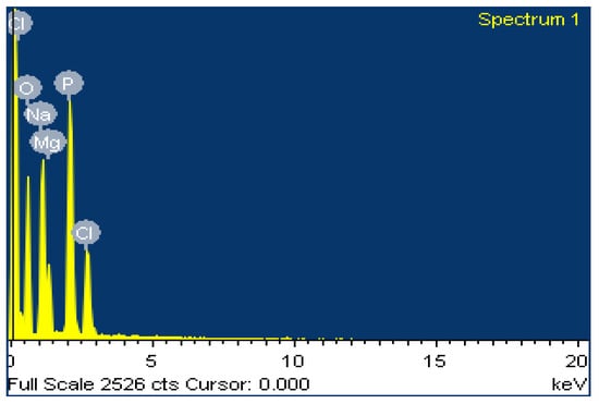 SEM-EDX spectra of the products containing struvite with a molar ratio of PO43−:Mg2+:NH4+ = 1:2:4 (B) at a pH of 9.0.
