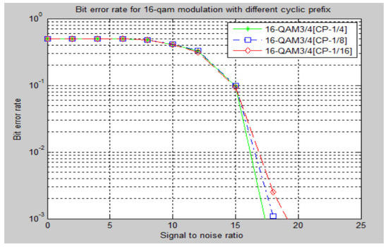 In this case, the cyclic prefix (CP) choices utilized are 1/4, 1/8, and 1/16 of the symbol time, which corresponds to the number of FFT samples. Findings indicate that the cyclic prefix of 1/4 had a lower BER compared to the cyclic prefixes of 1/8 and 1/16. The greater the cyclic prefix, the more effective it is in avoiding interference between symbols; nevertheless, the higher the full time of symbol, the longer it takes to communicate the same information [15]. Therefore, a lower cyclic prefix, such as 1/4, has a better bit error rate than higher cyclic prefixes, such as 1/8 and 1/16, as shown in Figure 7.