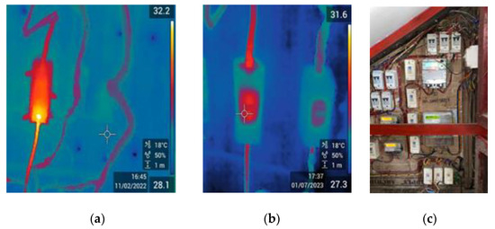 Figure 5. (a) Hotspot in MCB; (b) post correction; and (c) meter installation with MCBs.