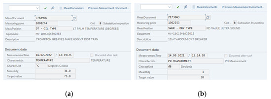 AEML-D has deployed a yearly substation inspection [7] through which observations and measured values are captured on a mobility platform. The mobile app is integrated with SAP wherein the values are captured as measurement points (Figure 7). An asset-wise trend analysis is performed to predict anomalies through data analytics. The data model has been successfully deployed for MV cable assets with a 98% fault accuracy. Through substation inspection, developing and incipient anomalies are captured before the failures. The condition-monitoring technologies used are thermography, partial discharge monitoring (for MV assets) using TEV (transient earth voltage), and ultrasound.