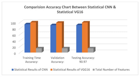 Figure 5 shows the results feature of VGG16 and Figure 6 represents the comparison result between the CNN and VGG16 approaches. Table 2 lists the number of features correctness of the training period, the test accuracy, and the accuracy of the validation verification, along with certain feature part assumptions for this study.