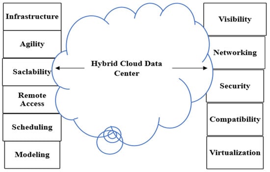 A cloud data center moves traditional on-prem data. A cloud data focus moves a regular on-prem data focus off-site. Instead of supervising their own system, an association rents an establishment regulated by an outside associate and obtains data focus resources over the Internet []. In these circumstances, the cloud benefit provider is aware of required maintenance and updates and obtains an advantage-level understanding of the pieces of the system stack within their direct control. Data focuses comprise parts set up to perform three principal functions. Process resources provide the memory and control required to run applications. Limited resources have undertaking data on a collection of media, counting fortifications []. Organizing resources reinforces interchanges between the various parts of the data center and the outside world. Present-day data habitats have superior class structures, causing several difficulties for data focus chiefs and characterizing data communities comprising various gear and PC program game plans from various merchants [,]. Data focus chiefs are responsible for conveying, orchestrating, checking, and maintaining systems and their connected licenses, security, and re-designs, and this is just the beginning when considering various data habitats with moving advancement levels []. In Figure 1, a description of hybrid cloud data center features is provided. Data focus chiefs should meet specific SLAs, providing openness, data support, recovery speed, etc., for complex circumstances. Data focus chiefs are expected to maintain consistent contact with organizations and applications regarding closing plans. This involves ensuring that each data center has the resources required and executing changes taken after modifying an organization’s underwriting structure. Figure 1 explains hybrid cloud data system features. Data focuses should utilize strict spending plans in which essential and cooling costs are prioritized. These qualities and assets are to be acquired considering the qualities they bring rather how they fit to a data community’s requirements and difficulties [,,]. Data focuses support all endeavors from registration and management to business applications. To the extent that current businesses utilize PCs, the data community is critical. Data focus centers enables associations consider how they control their data, thus prompting associations to focus on IT and data when the preparing the workforce, registering and sorting out network establishment, and determining a plan for office security [].