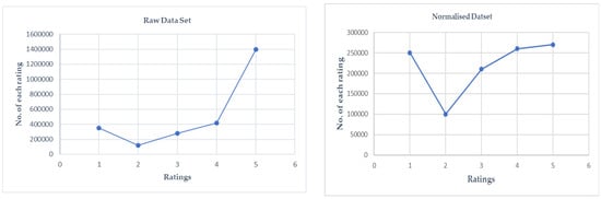 Text preprocessing focuses on transforming raw data into a format suitable for analysis using text cleaning, tokenization, stop word removal, lemmatization, etc. The Amazon video game review dataset exhibits a bias towards 5-star reviews, which account for 1.4 million out of 2.7 million reviews. To normalize the dataset, each rating was associated with 260,000 reviews by calculating the average number of reviews excluding 5-star ratings. Figure 2 shows the raw and normalized data set.