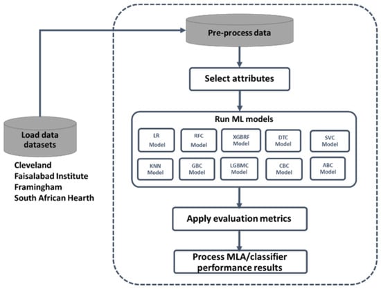 With the advancements in modern healthcare and technology, heart disease prediction has become a prominent concern within the medical realm [8]. This is based on a comprehensive evaluation of various data, such as physical features and medical information, in combination with other factors that may influence the risk of developing cardiovascular conditions. Certain devices can detect changes in the body which may indicate possible cardiovascular issues [9]. For example, a continuous glucose monitor can alert healthcare providers to any changes in blood sugar levels, which may signal a greater risk of morbidity from heart disease. Despite the advances that have been made in the prediction of heart disease, there is still much to be materialized in order to ensure that individuals receive timely preventative care [10]. As is so often the case, the best outcome is prevention, but current approaches to diagnosing and treating heart disease usually focus on identifying and treating issues after they have manifested, leaving many individuals at risk of future health issues [11,12,13]. Furthermore, there is some evidence to suggest that major risk factors, such as genetic predisposition, lifestyle habits, and environmental factors, are all interconnected, and taking into consideration all these factors is necessary to accurately identify risk and prevent problems before they arise [14]. Another issue faced by modern healthcare when it comes to predicting heart disease is the disconnect between medical providers and patients. Patients may need to take a more proactive approach in terms of monitoring their own health, but may be unaware of the potential risks or lack the resources to seek out proper medical advice [15,16]. There can be a lack of coordination between different healthcare providers. It is important that data on peoples’ cardiovascular health be more widely shared among various medical and healthcare providers. Sharing means collecting and storing the data so that each provider has comprehensive access to it [17]. Predicting heart disease in modern healthcare requires a more comprehensive, integrated, and individualized approach that incorporates key risk factor assessments and better communication and collaboration among medical practitioners [18,19].