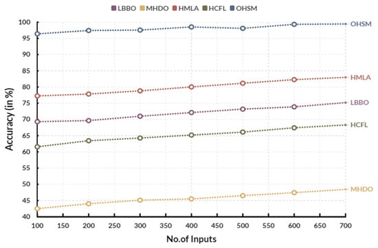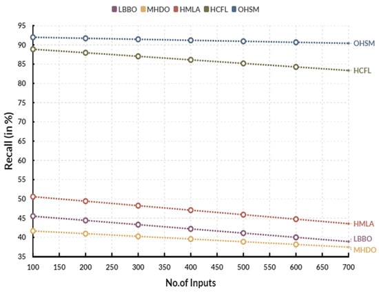 Figure 5 shows a comparison of recall. In a computation cycle, the proposed OHSM reached 91.19% recall. The existing LBBO achieved 42.21%, MHDO reached 39.57%, the HMLA reached 47.07%, and HCFL obtained 86.11% recall.