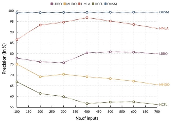 Figure 4 shows a comparison of precision. In a computation cycle, the proposed OHSM reached 99.27% precision. The existing LBBO achieved 80.33%, MHDO reached 69.20%, the HMLA reached 96.79%, and HCFL obtained 56.65% precision.