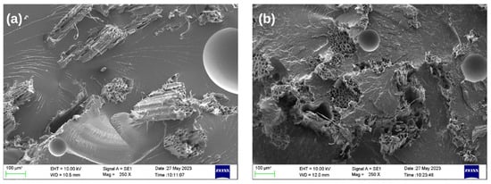 Scanning electron microscopy (SEM) images at 250× magnification and 100 microns showing a comparison between (a) a composite without nanoclay and (b) a composite with 2.5% MMT nanoclay.