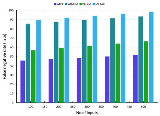Figure 3 shows the comparison of false negative rate. In a computation tip the proposed MLTAF reached 94.21% false negative rate. The existing AICF obtained 48.65%, AIMLM reached 89.50%, and PHRM obtained 61.64% false negative rate.