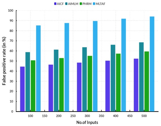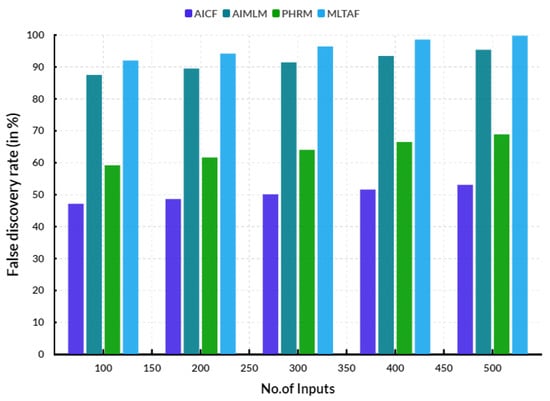 Figure 5 shows the comparison of false discovery rate. In a computation tip the proposed MLTAF reached 96.41% false discovery rate. The existing AICF obtained 50.14%, AIMLM reached 91.47%, and PHRM obtained 64.06% false discovery rate.