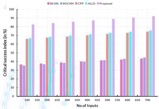 Figure 3 shows the comparison of the critical success index. In a computation cycle, the proposed model reached an 87.33% critical success index. The existing BCNN achieved 40.05%, BOCNN reached 39.92%, CPP reached 70.17% and ALLD obtained a 71.26% critical success index.