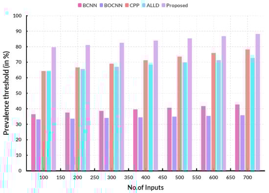Figure 4 shows the comparison of the prevalence threshold. In a computation cycle, the proposed model reached an 83.99% prevalence threshold. The existing BCNN achieved 39.63%, BOCNN reached 34.51%, CPP reached 71.32%, and ALLD obtained a 68.49% prevalence threshold.