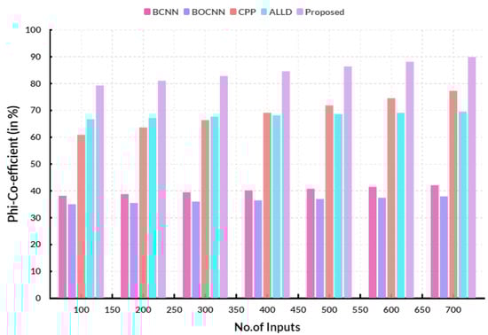 Figure 5 shows the comparison of the phi-co-efficient. In a computation cycle, the proposed model reached 84.60% phi-co-efficient. The existing BCNN achieved 40.17%, BOCNN reached 36.50%, CPP reached 69.12%, and ALLD obtained 68.16% phi-co-efficient.