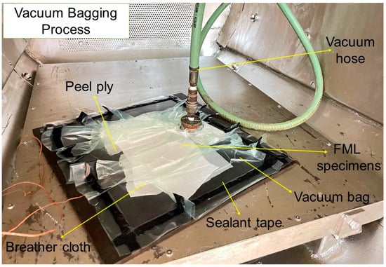 Specimen preparation using a vacuum bagging setup in an autoclave.
