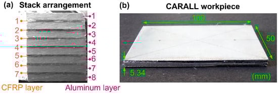 (a) Stack arrangement in the fabricated CARALL specimen. (b) Fabricated CARALL specimen.