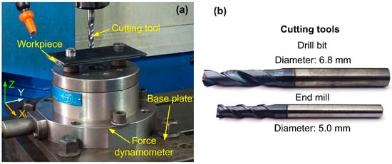 The experimental study was conducted to evaluate the performance indices, including cutting forces, machining temperature, surface roughness, chip morphology, and burr size for both hole-making processes. Additionally, microscopic characterization of the boreholes was performed to verify the presence of surface damage and delamination defects. Machining trials were conducted on a Vertical Machining Center (VMC), using the setup shown in Figure 3a. The drilling was conducted using a 6.8 mm twist drill, while helical milling tests were carried out using a 5 mm end mill, as shown in Figure 3b. Table 1 lists the process variables selected for experimentation. Experimentation used three cutting speeds of 30, 60, and 90 m/min, keeping the feed constant. The parity between the two hole-making processes was maintained by keeping the machining time similar and maintaining a constant feed.