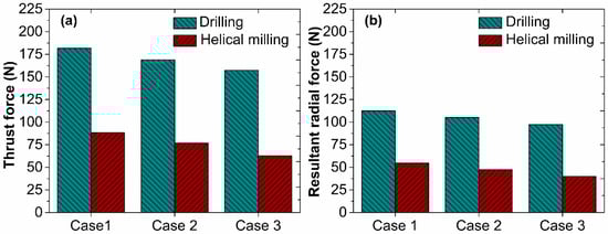 Figure 4 depicts the behavior of thrust force and resultant radial forces with the cutting speeds for both processes. The cutting force magnitude is lower during the helical milling process. For example, the thrust force magnitude (Case 3) recorded during the drilling operation was 157.3 N, while the helical milling was 62.5 N (see Figure 4a). The radial force generated for the two hole-making operations shows a trend similar to a thrust force. The resultant radial during the drilling operation was 101.7 N, while the helical milling had a magnitude of 39.8 N (see Figure 4b).