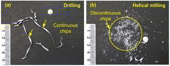 Figure 5 displays the chips formed during the two hole-making operations. Drilling produced long continuous chips, while helical milling produced short discontinuous chips (see Figure 5. The production of such discontinued chips is preferable for easy chip evacuation and its ability to minimize surface damage.