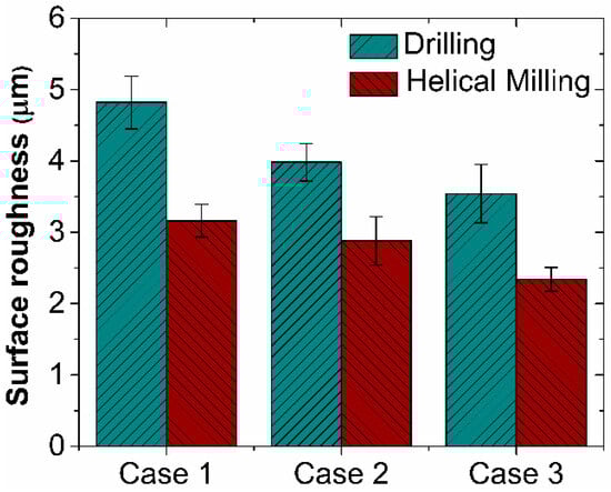 Figure 6 presents the comparison of surface roughness values between drilled and milled hole surfaces. As noticed, the surface roughness of drilled holes was higher when compared to helically milled ones. The highest surface roughness was obtained from Case 1. Drilling resulted in a surface roughness value of 4.8 µm, whereas helical milling had a lower roughness value of 3.1 µm for Case 1.