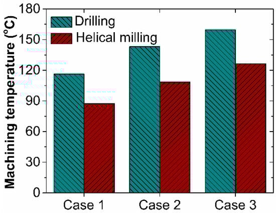 Figure 7 gives the comparison between machining temperatures for drilling and helical milling operations for three cases. A higher machining temperature was observed in drilling than in helical milling for all the test cases. The machining temperature developed during drilling was 155.6 °C, and in the helical milling process, it was 114.4 °C. The maximum temperature resulted in Case 3.