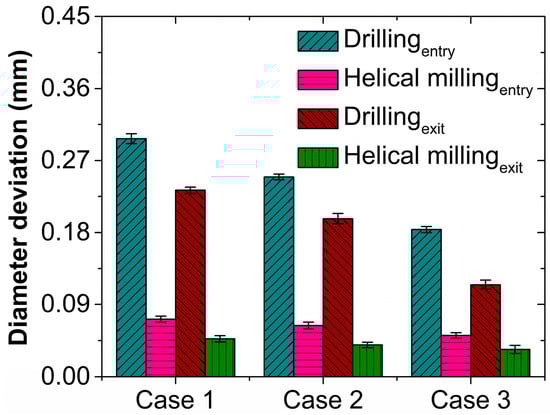 Figure 8 shows that both operations generated holes that were larger than the nominal dimension (6.8 mm). However, the diametrical deviation was higher in the drilled holes in comparison to the helically milled holes. The diametrical deviation was higher at the entry compared to the exit hole, a similar trend was observed for all the cases and both hole-making processes.