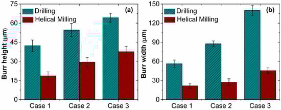 Figure 9a,b compares the burr height and burr width obtained for all three cases, respectively, for both hole-making processes. Burrs of prominent size were observed in the drilled holes, and relatively small-sized burrs were observed for helical milling. The highest burr sizes resulted in Case 3 for both processes.