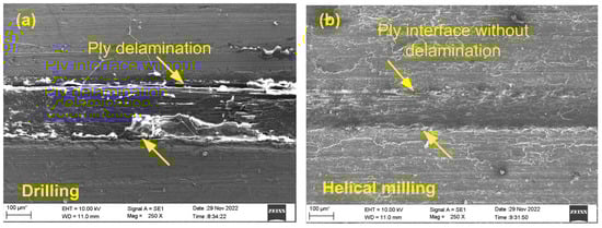 Figure 10a,b provides the scanning electron microscope images of the machined hole surfaces for drilling and helical milling, respectively. Ply delamination was observed in a hole drilled using a higher speed and feed. However, the helical milling generated damage-free holes, even under similar processing conditions.