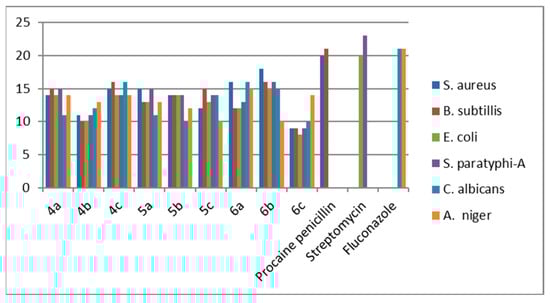Bacterial peptone (6 g), a pancreatic digest of casein (4 g), yeast extract (3 g), beef extract (1.5 g), dextrose (1.0 g), and agar (15.0 g) were all dissolved in distilled water to make 1 L of the medium. Then, 1M sodium hydroxide and 1M HCl were added to the solution to bring it to the desired pH (6.5–6.6). To obtain 40 g/mL, the test materials were all dissolved in the lowest amount of dimethyl formamide (DMF), and the final volume was made with distilled water. The cup–plate approach involves diffusing an antibiotic through a Petri dish’s hardened layer of agar to the point where it completely stops the development of the added microbe in a circle or zone surrounding the cavity containing the antibiotic solution. After being injected with the required amount of the microbe suspension at a temperature of 40 to 50 °C, the previously liquified medium was then poured onto Petri plates to a depth of 3 to 4 mm. Agar was removed from each Petri dish using a sterile cork borer after five identically sized cups were pierced. Using sterile pipettes, the standard and sample solutions were introduced to the bored cups at predefined concentrations. The plates were allowed to stay at room temperature for one hour in order to reduce the impact of the time differences between the applications of different solutions. These were then kept at 37 °C for the following 24 h. Then, the zone of inhibition developed was precisely measured and noted. There were three average readings for each zone of inhibition that was recorded. Separate calculations were made for the water zone of inhibition.