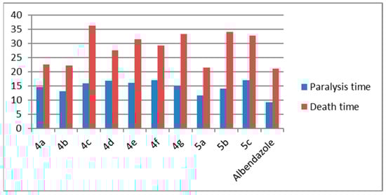 The anthelmintic activity actual result is summarized in Table 2 and the comparison of activity is shown in Figure 3. All of the studied drugs exhibited good-to-great activity, according to the data. Among the screened compounds, heterocycle 5a showed excellent activity, and it was also comparable with the standard drug Albendazole. This may be due to the presence of methyl (-CH3) and ethyl alcohol (-CH2-CH2-OH) groups linked to the benzimidazole ring through the piperazine ring. In addition, compounds 4a and 4b showed moderated activity, which may be due to the presence of methoxy (-OCH3) and methyl (-CH3) groups. This result shows that the compounds with electron-donating groups have potent anthelmintic activity. Other compounds showed moderate activity.