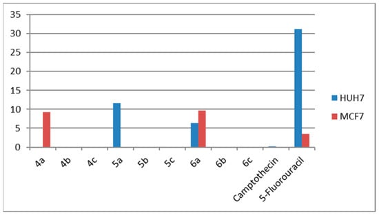 IC50 values of tested heterocycles against human liver (HUH7) and breast (MCF7) cancer cell lines in µg/mL.