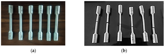 (a) Prepared tensile test specimens. (b) Tensile test specimens after the test.