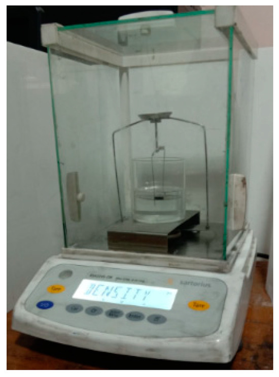 Density tests were conducted as per the Archimedes water displacement method (ASTM D792) [19] using a densometer according to which the test samples were weighed in the air, followed by weighing it immersed in distilled water at room temperature (assumed as 28 °C). The density of water at 28 °C is considered as 0.99626 g/cm3. Density was calculated using the relation shown in Equation (1).