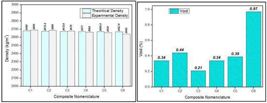 where ρc, ρm and ρr are density of composite, matrix, and reinforcement, respectively; Vm and Vr are volume of matrix and reinforcement, respectively. The theoretical density calculated, and experimental density obtained are listed in Table 6. Figure 10 shows the density test results of aluminium–boron carbide–graphite composites.