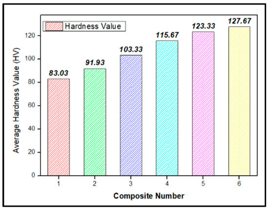 Hardness tests were performed on a Micro-Vickers hardness tester according to the ASTM E384 standard [20]. Performing hardness tests using a Micro-Vickers hardness tester and following the ASTM E384 standard is a well-established method for measuring the hardness of materials. ASTM E384 is a standard test method for micro-indentation hardness testing, and it provides guidelines for conducting Vickers hardness tests at small loads, specifically in the micro-hardness range. Proper surface preparation is a fundamental aspect of hardness testing and is vital for obtaining accurate and meaningful data, leading to better material characterization and understanding of its mechanical properties. The maximum load applied during indentation was 0.3 Kgf and the load was maintained for a duration of 10 s. The average values were computed for each sample and are presented in Table 7. From Figure 11, it can be observed that, when the quantity of boron carbide is increased while keeping the quantity of graphite reinforcements fixed, the hardness values increases.