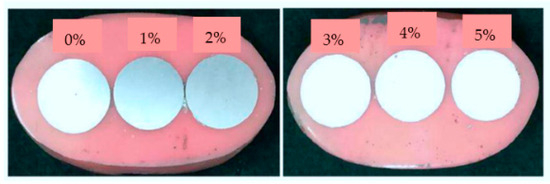 where ρw and ρc are the density of water and composite, respectively, at room temperature; mw and ma correspond to mass of composite specimen in water and air, respectively. A specimen of diameter 12 mm and thickness 3 mm was prepared for conducting the test for each composition as shown in Figure 9.