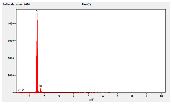 EDS is particularly useful for identifying elements on the surface of a sample and for providing qualitative and semi-quantitative information about the composition. The EDS spectrum for the aluminum LM6 alloy are shown in Figure 14. It shows the existence of a high percentage of aluminum along with silicon, carbon, oxide and magnesium. The EDS spectrum of composite specimens containing 5% boron carbide and 1% graphite is shown in Figure 15. Elemental composition of the sample confirms the presence of several more elements: boron (B) and carbon (C), in addition to silicon (Si), aluminum (Al), magnesium (Mg), and oxygen (O).