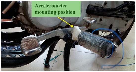 The measurement of the acceleration was carried out by mounting the accelerometer on the footrest of the two-wheeler. The two-wheeler was tested under an actual driving scenario considering both the rider and pillion with a payload of 160 kgf. The road considered was a normal asphalt road with potholes and humps. The footrest of the vehicle, as shown in Figure 1, was the strategic location considered for the study. A PCB Piezotronics accelerometer with a sensitivity of 103.6 mV/g mounted on the footrest, as shown in Figure 1, acquired the acceleration signals that were required to measure the rider’s comfort. The software used was the National Instrument’s LabVIEW software (LabVIEW 2019).
