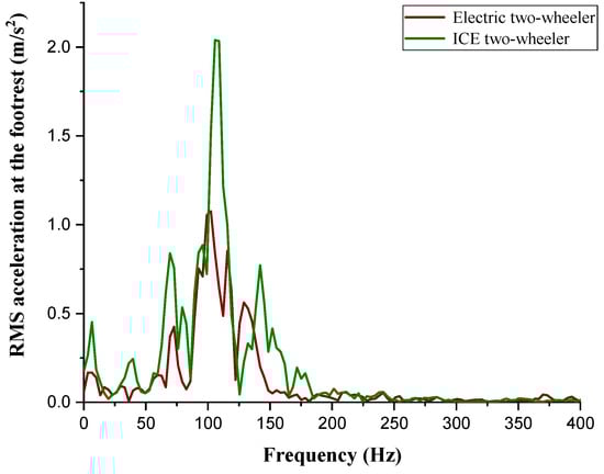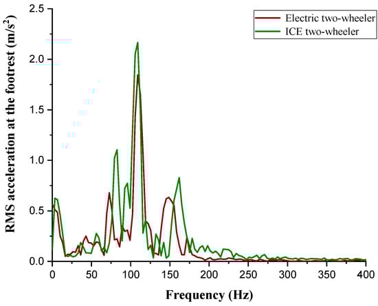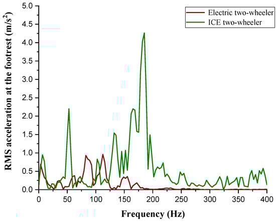 Figure 4 shows the comparison of the footrest vibration in the case of the ICE-based and electric two-wheeler. This test was conducted by running the vehicle for approximately 300 m at a speed of 30 kmph. The RMS value of acceleration decreased in the case of the E2W when compared to the ICE-based vehicle, as shown in the figure. However, the vibrations resulting from the E2W further require damping treatment in order to improve the rider’s comfort. Further, the calculation of the VDV as per Equation (1) gives scope to predict the rider’s comfort as per the ISO 2631 standard.