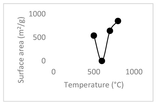 There was an observed increase in surface area with an increase in activation temperature. A larger pore volume was obtained when the impregnation temperature was higher. The samples impregnated with sulfuric acid exhibited the lowest surface area at the lowest temperature of 500 °C, but also showed the lowest % removal, as shown in Table 4 and Figure 1, with the sample failing at 600 °C. Samples chemically activated with nitric acid showed the lowest surface area at 500 °C and achieved the highest % removal.